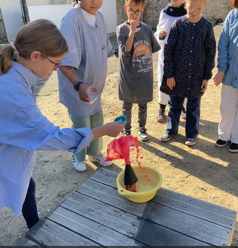 En sciences, nous avons travaillé sur les cracheurs de feu. Les CM ont découvert, à travers une expérience, le fonctionnement des volcans et ont appris à différencier les volcans explosifs et effusifs.