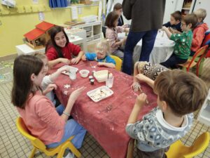 Jeudi 27 novembre, tous les élèves se sont mélangés pour préparer des décorations de Noël qui seront exposées à l’occasion du MARCHE de NOËL, vendredi 05 décembre prochain dès 16h30.