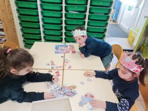 Ainsi nous avons compté des collections de 100 (il y avait même 100 oeufs de Pâques!), fabriqué des couronnes avec 100 points, cherché le nom de 100 fruits et légumes, fait des puzzle de 100 pièces!