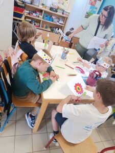 L’après midi, avec la classe de CE1/CE2 nous avons colorié et découpé 100 fleurs pour fêter le printemps!