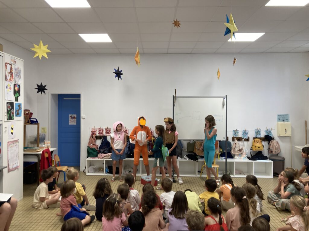 Le 26 juin, les CM ont participé à un concours de poésie. Il s’est déroulé dans la salle aux étoiles devant les autres classes. Les maitresses ont joué le rôle…
